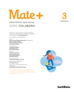 Este libro es una obra colectiva concebida, diseñada y creada en el departamento de Ediciones de Santillana, bajo la dirección de Teresa Grence Ruiz. En su elaboración han participado: TEXTO María del Pilar Reguera Beriguistain (coordinación) María José García Brenes Federico Rodríguez Merinero Inés Sánchez Periñán ILUSTRACIÓN Jordi Baeza Albalate Elisa Munsó Griful Fermín Solís Campos EDICIÓN Ana de la Cruz Fayos Silvia Escalante Torres Núria Grinyó Martorell Silvia Marín García EDICIÓN EJECUTIVA Carmen Ríos Collantes de Terán DIRECCIÓN DEL PROYECTO Ana Uguina Orozco DIRECCIÓN Y COORDINACIÓN EDITORIAL DE PRIMARIA Maite López-Sáez Rodríguez-Piñero Las actividades de este libro no deben ser realizadas en ningún caso en el propio libro. Las tablas, esquemas y otros recursos que se incluyen son modelos que deberán ser trasladados a un cuaderno. Ma t emá t i c as pa r a p ens a r SER I E CO L ABO R A P R I MAR IA